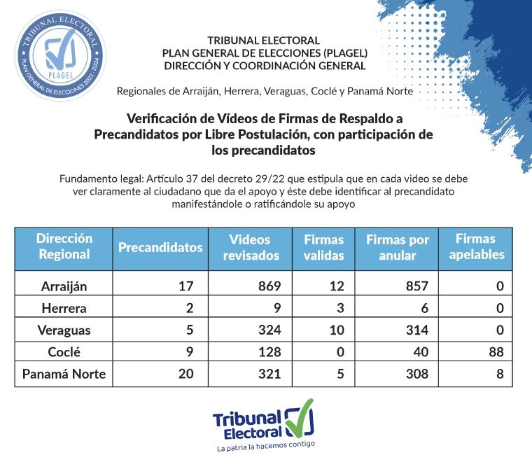 Se trata de las provincias de Herrera, Coclé, Veraguas, la región de Panamá Norte en la provincia de Panamá y el distrito de Arraiján, en la provincia de Panamá Oeste. El pasado lunes inició en todo el país la revisión de estas firmas, en presencia de los precandidatos y sus representantes.
