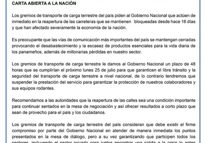 Este gremio, a través de una carta abierta, advierte que el plazo otorgado será hasta el próximo lunes, 25 de julio, para que el Gobierno garantice el libre tránsito y la seguridad del transporte de carga terrestre a nivel nacional, de lo contrario tendrán que suspender la prestación del servicio para salvaguardar la protección de los conductores y equipos rodantes.