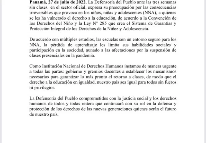A través de este paro, se está vulnerando el derecho a la educación a miles de niños(as) y jóvenes panameños.