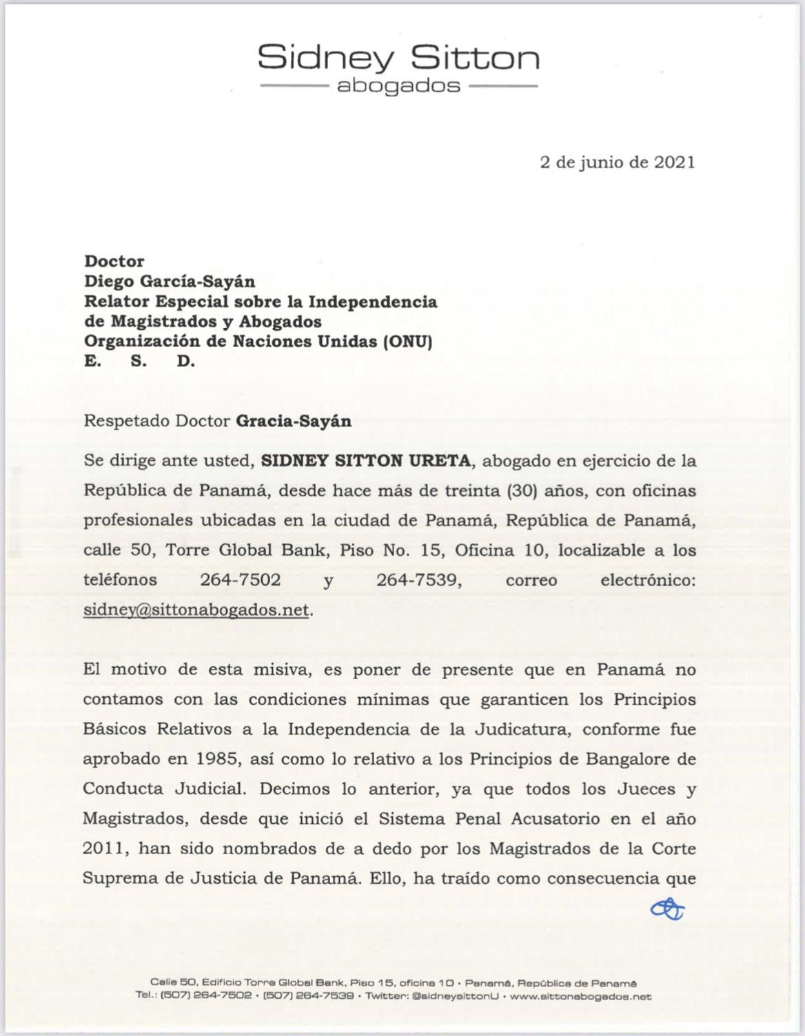 En su nota, Sittón señala que, para demostrar sus planteamientos, solicitó mediante nota dirigida al presidente de la Corte de Panamá, Luis Ramón Fábrega, fechada 31 de mayo de 2021, copias autenticadas del acuerdo de nombramiento y acta de toma de posesión de la juez de garantías.