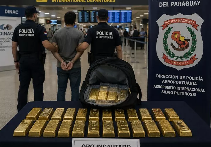 La Policía Nacional de Paraguay detuvo ayer en el aeropuerto Silvio Pettirossi, que sirve a Asunción, a un ciudadano brasileño que pretendía abordar un avión con destino a Panamá con 27 kilos de oro ocultos en una mochila.