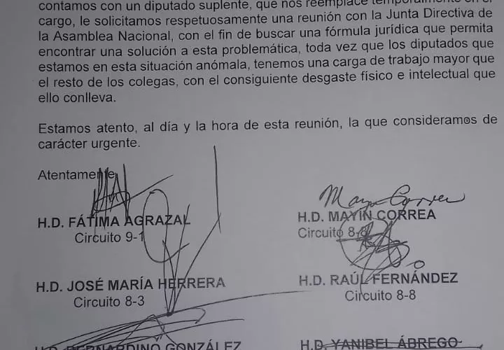 La nota del 15 de enero pasado, lleva las firmas de los diputados Fátima Agrazal, Mayín Correa; José María Herrera, Bernardino González y Raúl Fernández. Además de los mencionados la diputada Yanibel Ábrego tampoco tiene suplente.