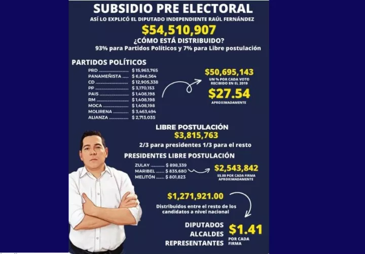El diputado independiente Raúl Fernández compartió una infografía que desglosa el subsidio pre electoral de 54 millones 510 mil 907 dólares ,que el Tribunal Electoral destina a los partidos políticos y candidatos de libre postulación.