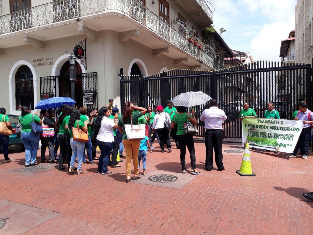 Un grupo de docentes de las áreas de difícil acceso de la provincia de Colón, específicamente de Costa Arriba y Abajo, prostestan hoy, lunes en los predios de la Presidencia de la República, San Felipe, porque exigen el cumplimiento de ajustes salariales.