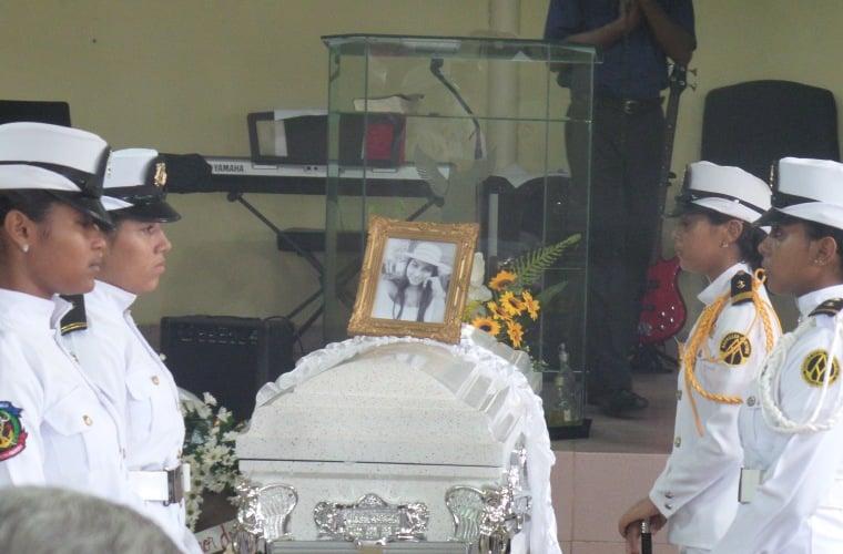 El ataúd, totalmente blanco, en el que estaba el cuerpo de Nicole, se hallaba ubicado en el medio del templo, y custodiado por el grupo de escoltas femeninas de la escuela Artes y Oficios, quienes, uniformadas con atuendo marino, permanecieron en pie a ambos lados del féretro.