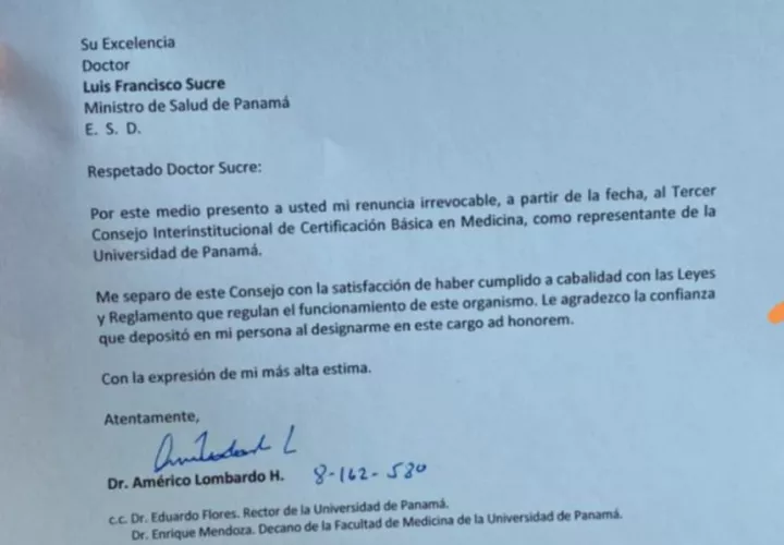 El doctor Américo Lombardo presentó su renuncia irrevocable al consejo interinstitucional de certificación básica de medicina como representante de la Universidad de Panamá.