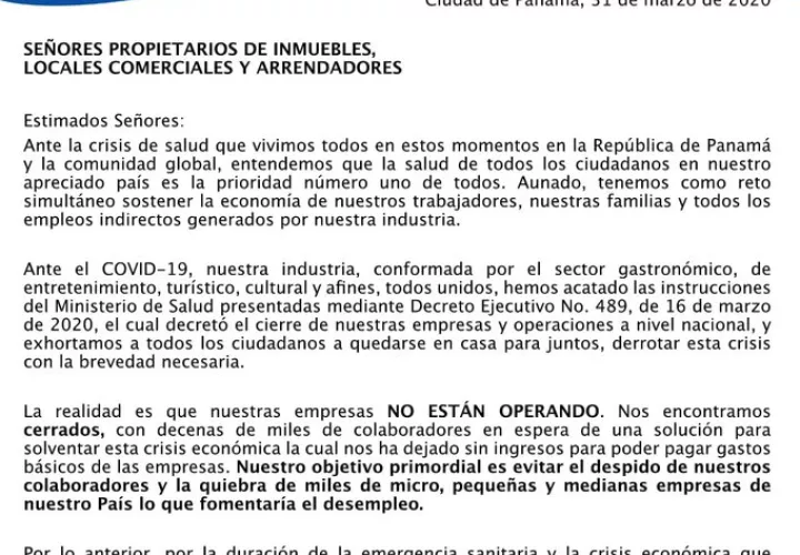 Estas agrupaciones ,a través de un carta abierta dirigida a los propietarios de inmuebles, locales comerciales y arrendadores, expresan que la realidad es que las empresas dedicadas a la gastronomía y entretenimiento no están operando desde hace 15 días a raíz de la declaración de la pandemia por coronavirus en el país.
