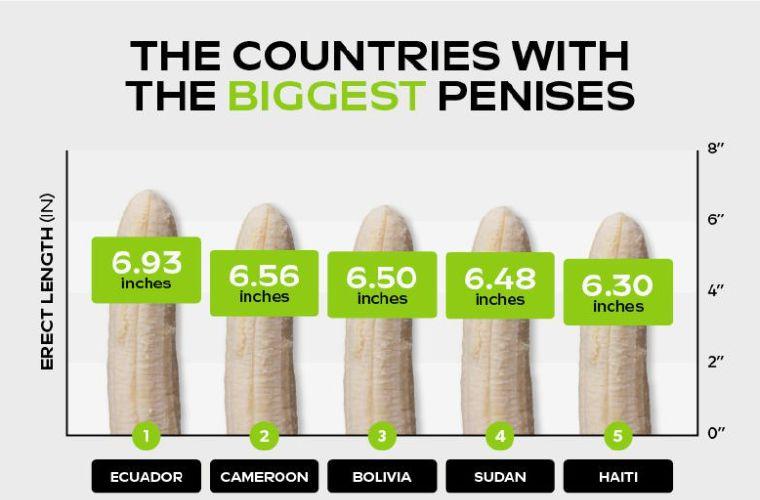 Los ecuatorianos aparentemente tienen los penes más grandes, con un promedio de 6.93 pulgadas, mientras que los más pequeños se pueden encontrar en Camboya con solo 3.95 pulgadas de largo cuando están erectos.
