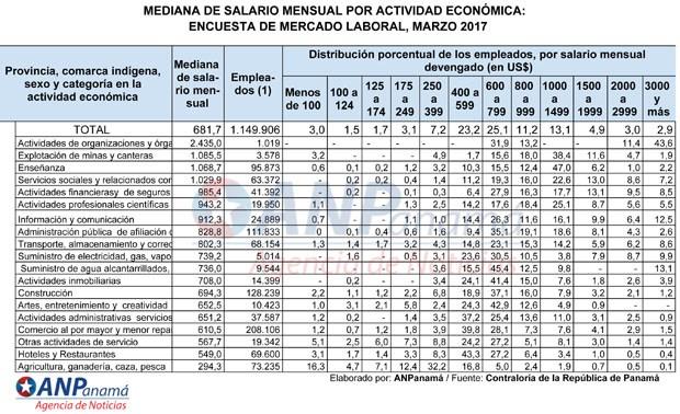 De acuerdo con la encuesta de propósitos múltiples de la Contraloría General de la República, publicada con datos a marzo de este año, los trabajadores de actividades de organizaciones y órganos extraterritoriales y actividades no declaradas (multinacionales ) en promedio devengan un salario mensual de US$2,435, mientras que lo que se dedican a la explotación de minas, el promedio de su salario mensual es de US$1.085, pero estos grupos solo representan a 4,595 personas.