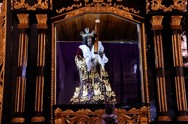 El origen de la imagen de madera, vestida de túnica morada, rostro sufriente, pero decorado con prendas de oro dejada por los fieles como prueba de amor y agradecimiento, se pierde en el tiempo. Unos dicen que fue encontrada, un 21 de octubre de 1658, dentro de una caja flotando en el mar. Los lugareños colocaron la imagen en la iglesia y en el acto cesó epidemia de cólera que azotaba al pueblo.