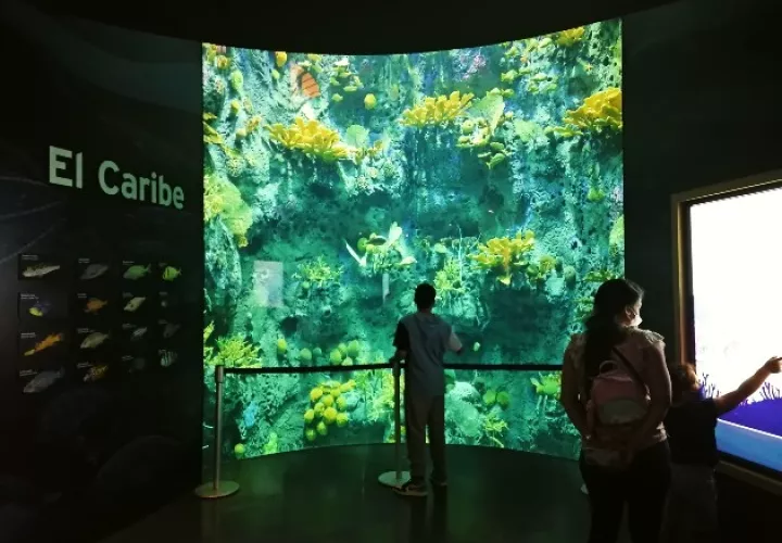 En el lugar, que es la fase B del Biomuseo, el cual involucra tres galerías, se pueden observar dos acuarios semicilíndricos que muestran cómo el Pacífico y el Caribe evolucionaron de maneras distintas, tras quedar separados. Un grupo de visitantes se asombra con la variedad de especies y la gran dimensión de “las peceras” (12 metros de alto por cinco de ancho cada una).