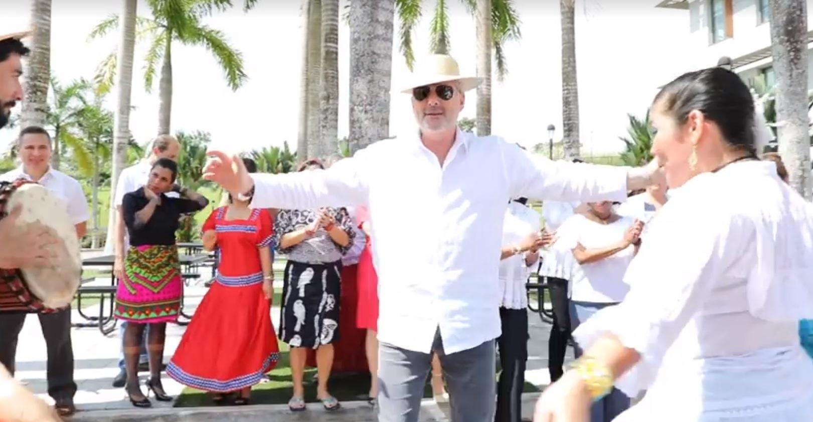 En el video, Feeley luce camisa blanca con mangas remangada, sombrero típico e intenta seguir los ritmos acordes al tamborito, junto a un grupo de representantes de la mujer panameña que muestran la belleza del traje típico del país.