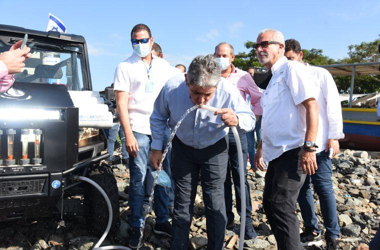Mansour participó en una demostración de la compañía israelí Galmobile. El lunes llegó temprano a la Cinta Costera 3, metieron un tubo en el mar e inmediatamente un vehículo con la tecnología israelí que opera como planta desalinizadora móvil, purificó el agua.