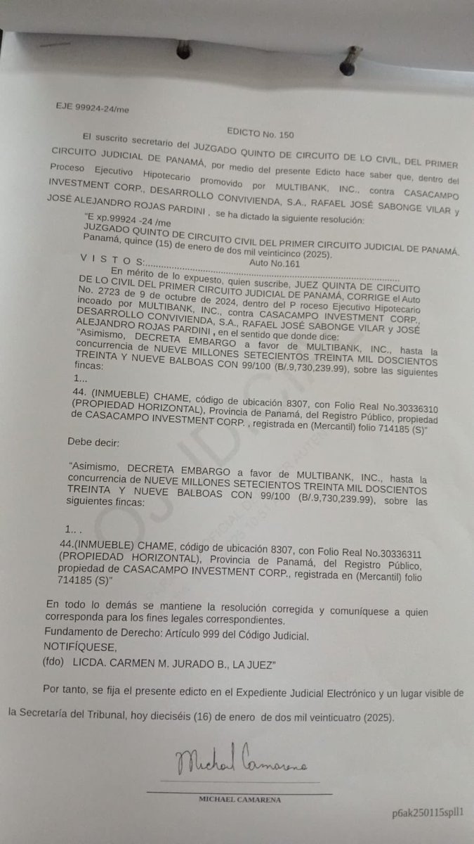 El Juzgado Quinto de Circuito Civil del Primer Circuito Judicial de Panamá decretó un embargo por la suma de B/.9,730,239.99 contra la empresa Casacampo Investment Corp, Desarrollo Conviviencia, S.A., y los empresarios Rafael José Sabonge Vilar y José Alejandro Rojas Pardini, en el proceso ejecutivo hipotecario promovido por Multibank, Inc.