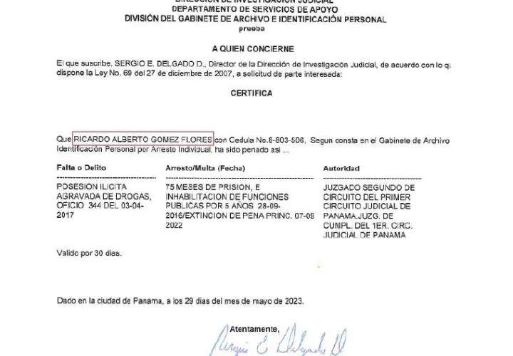 La escandaloso situación involucra al abogado Ricardo Gómez Flores, quien en abril de 2017 fue condenado a 75 meses de prisión e inhabilitación de funciones públicas por 5 años por el Juzgado Segundo Penal de Panamá y la pena se extinguía el 7 de septiembre de 2022, según destaca una certificación de la Dirección de Investigación Judicial.