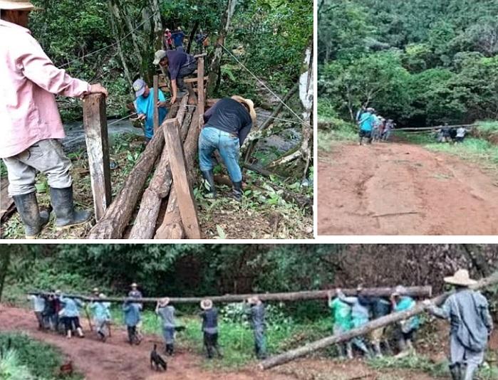 on machetes y hachas en mano, con el firme propósito de evitar más tragedias, familias enteras se unieron para talar árboles y construir un paso peatonal artesanal.