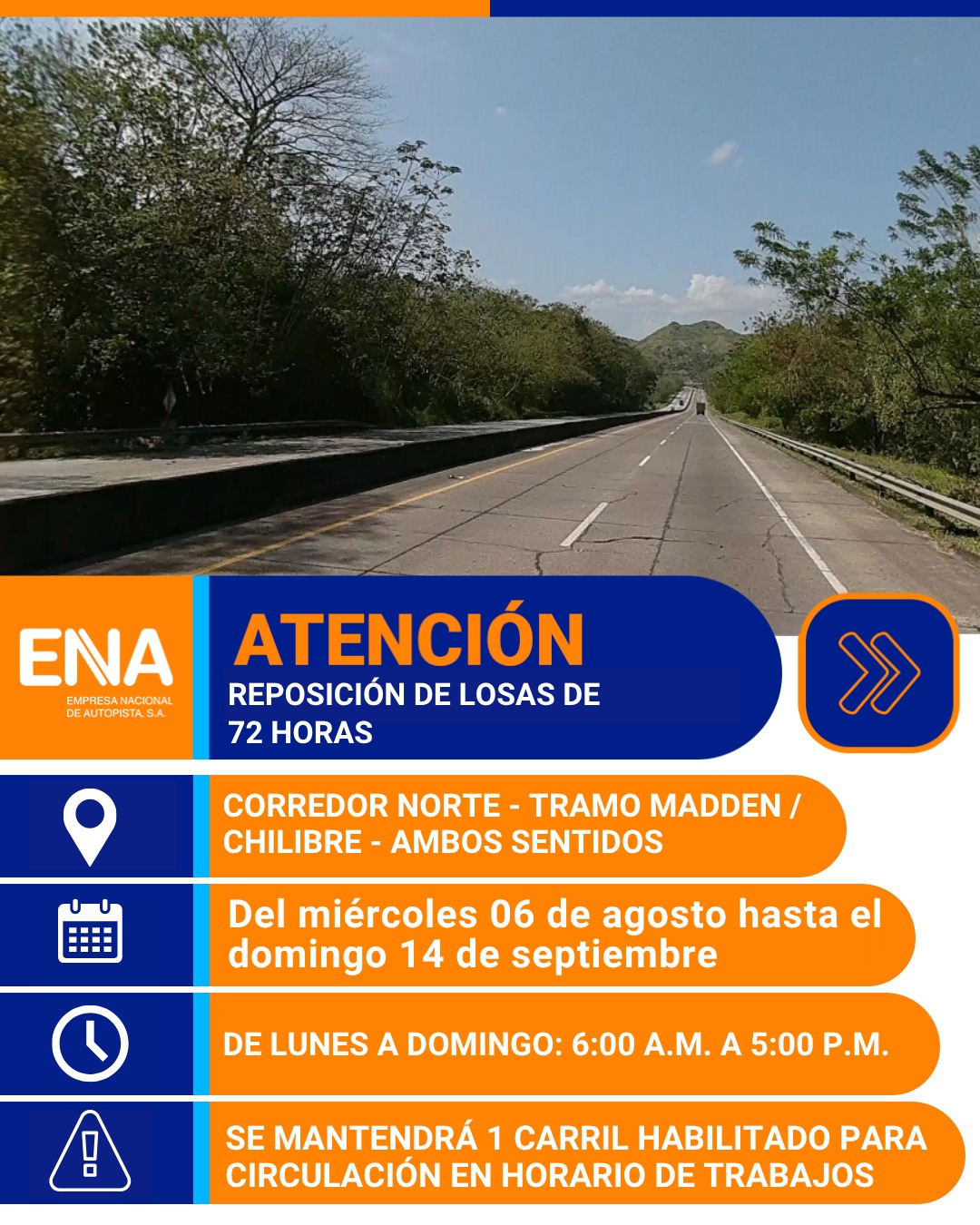Y no menos importante, la reposición de losas en el tramo Madden–Chilibre, desde el 6 de agosto hasta el 14 de septiembre, con labores entre las 6:00 a.m. y las 5:00 p.m., manteniendo siempre un carril libre.