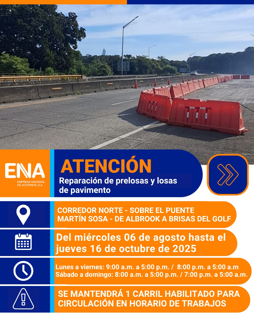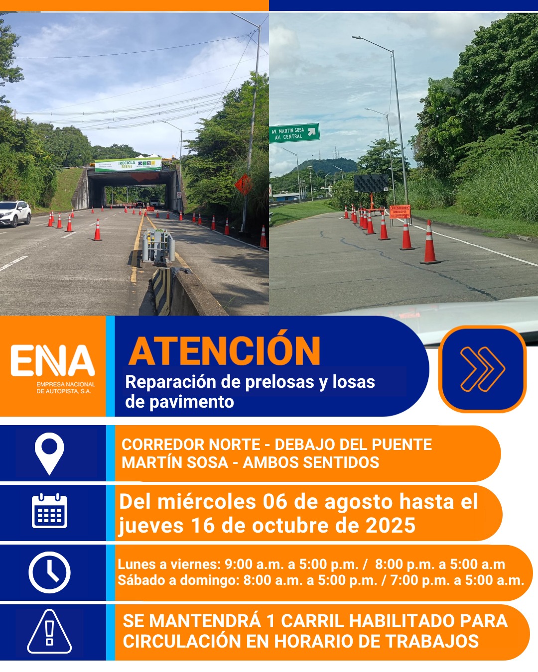 En el Corredor Norte, las obras se dividen en tres frentes. Primero, la rehabilitación bajo el puente de Martín Sosa en ambos sentidos, desde el 6 de agosto y hasta el 16 de octubre, con horarios de trabajo estrictos para evitar un caos en el tráfico: lunes a viernes de 9:00 a.m. a 5:00 p.m. y de 8:00 p.m. a 5:00 a.m., con horarios especiales los fines de semana. Eso sí, la ENA garantiza que siempre habrá al menos un carril abierto para facilitar el paso.