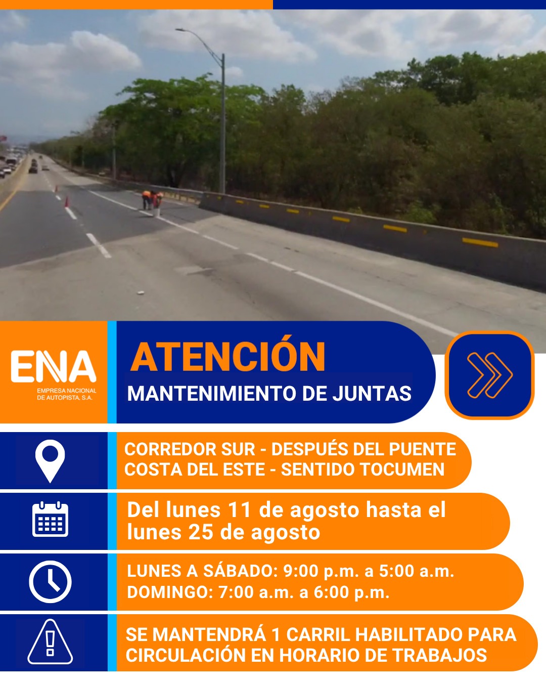 Mientras tanto, en el Corredor Sur, del 11 al 25 de agosto, se trabajará en las juntas del cajón pluvial del puente sobre el río Matías Hernández, justo después del puente de Costa del Este, en dirección a Tocumen.