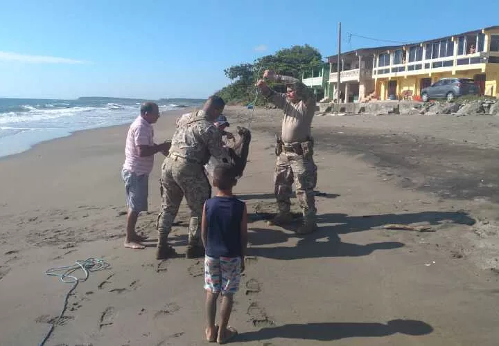 El personal técnico y las autoridades pertinentes realizan el seguimiento y monitoreo del animal por el área costera.