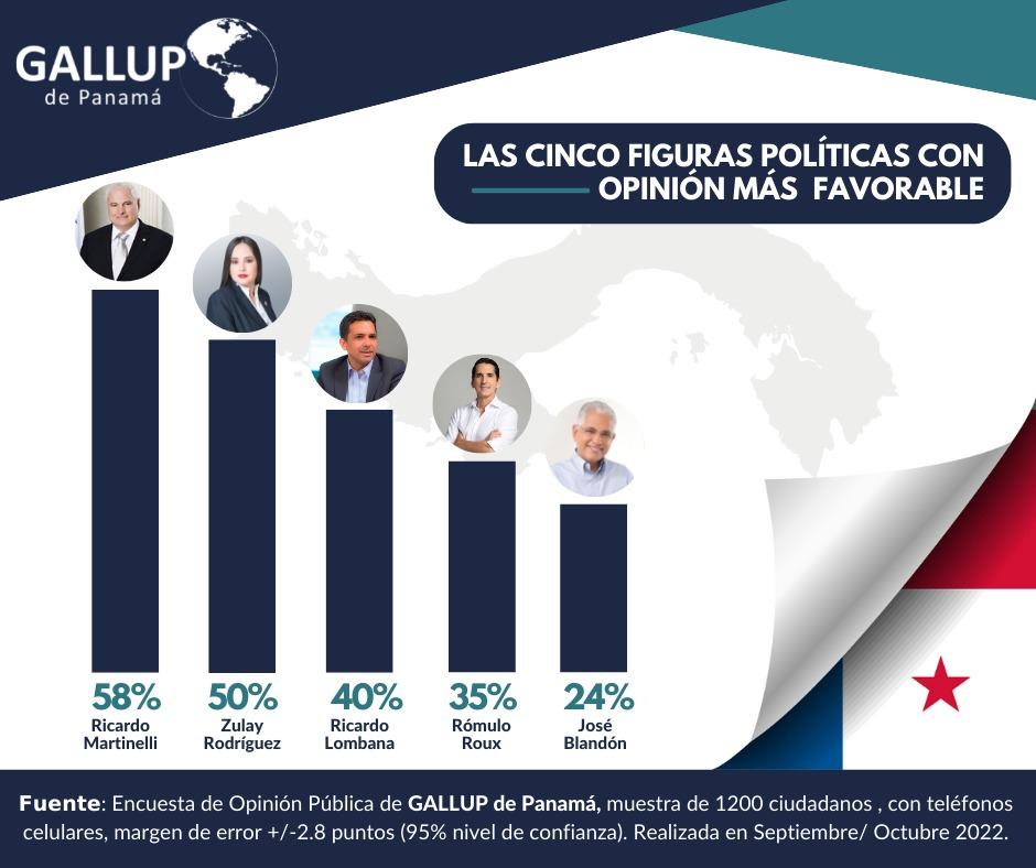 En una reciente encuesta realizada por Gallup de Panamá sobre las "5 figuras políticas con opinión favorable", el expresidente y presidente del partido "Realizando Metas", Ricardo Martinelli, se posesionó en el primer lugar con 58%; seguido de la diputada del PRD, Zulay Rodríguez con un porcentaje de 50.