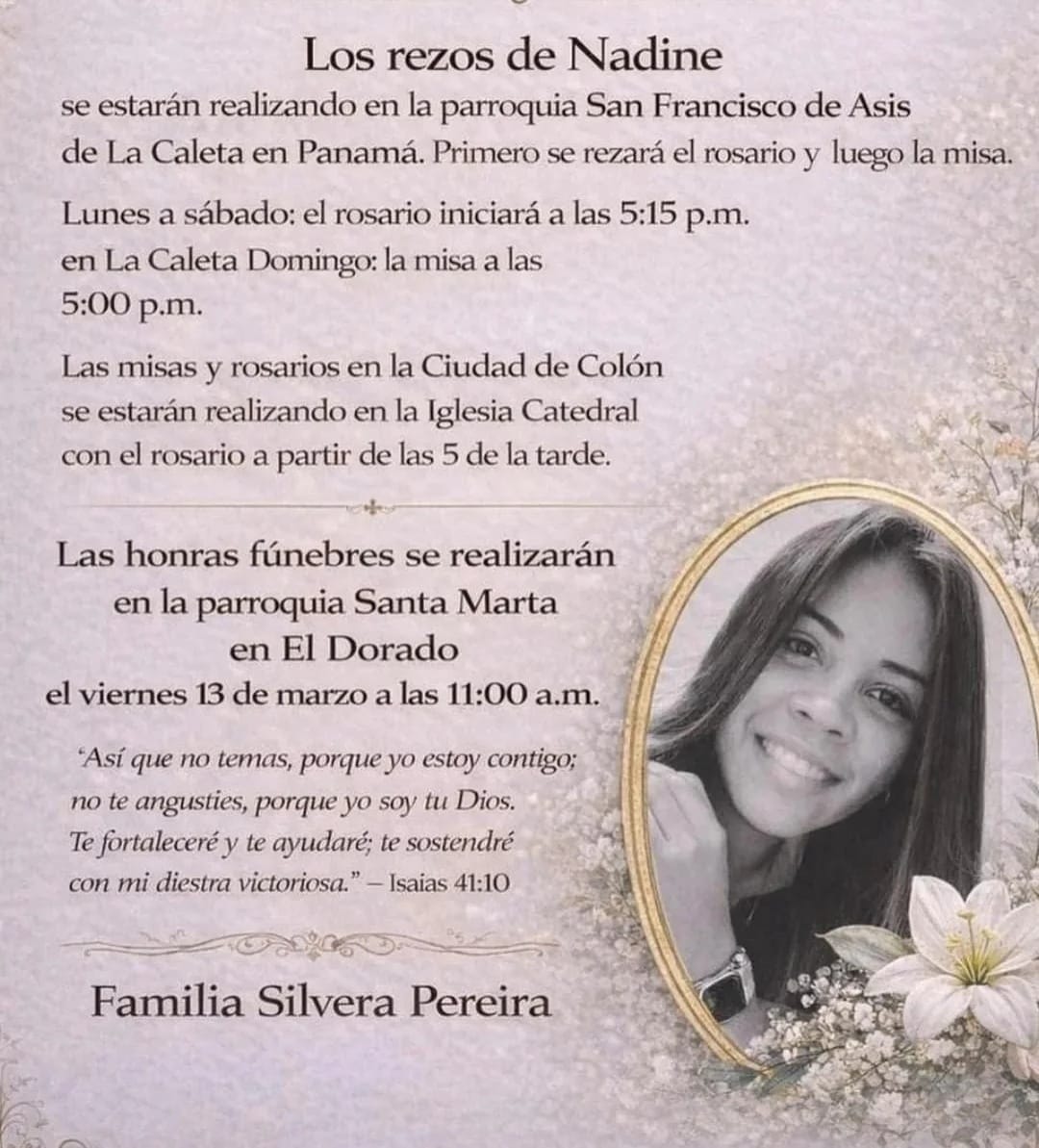 Dolor, lágrimas y en tiempos, silencio. Familiares, amigos y conocidos llegaron al templo de Santa Marta, en El Dorad .para decir adiós a la abogada Nadine De Jesús Silvera, de 38 años, quien fue asesinada a tiros hace una semana en la entrada de Costa del Este.
