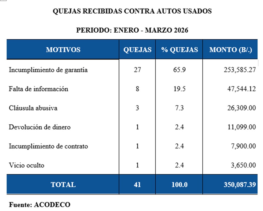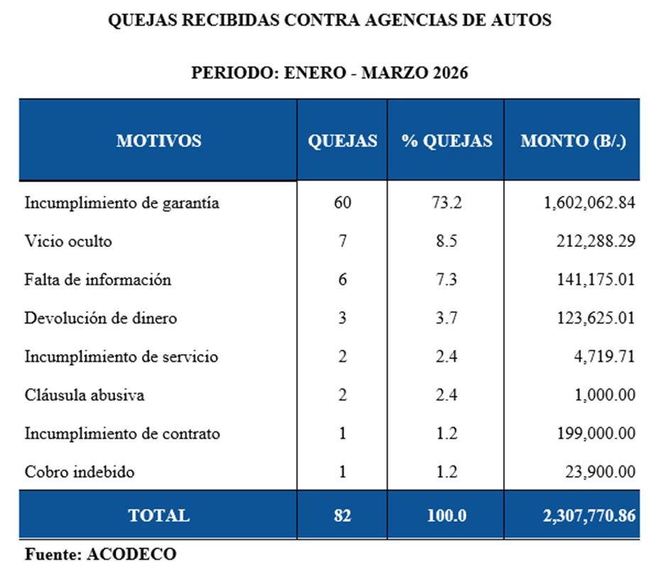 La Autoridad de Protección al Consumidor y Defensa de la Competencia (Acodeco) reportó que entre enero y marzo de 2026 se han recibido 123 quejas contra agencias dedicadas a la venta de vehículos nuevos y usados, con una cuantía total que supera los B/.2.6 millones.