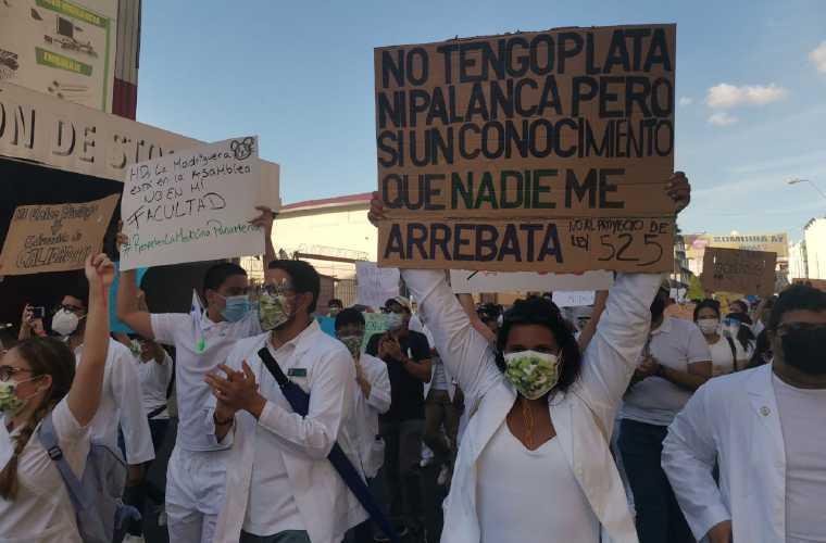 Estudiantes de medicina, residentes e internos de universidades públicas y privadas del país se manifestaron ayer frente a la Asamblea Nacional, exigiendo que se retire del debate legislativo un proyecto de ley que rebajaría las calificaciones mínimas para pasar los exámenes de certificación de médicos.