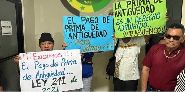 Un grupo de exfuncionarios públicos llevan a cabo una protesta pacífica este martes en las instalaciones de la Gobernación de Bocas del Toro para exigir el pago de la prima de antigüedad.