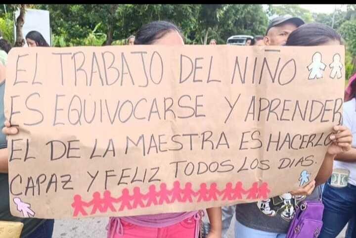 Una de las pancartas que sostiene una madre expresa: "El trabajo del niño es equivocarse y aprender; el de la maestra es hacerlo capaz y feliz cada día".