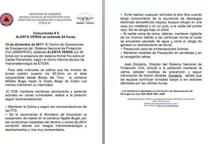 El Centro de Operaciones de Emergencia del Sistema Nacional de Protección Civil (Sinaproc) extendió por 24 horas hasta hoy la alerta verde por la presencia del sistema frontal frío sobre el Caribe panameño.