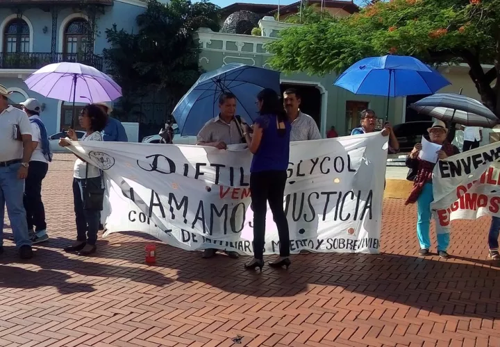 Panamá- Un grupo de víctimas y familiares de personas fallecidas del envenenamiento masivo por dietilenglicol protestan hoy, miércoles, en los predios de la Presidencia de la República, ubicada en San Felipe.