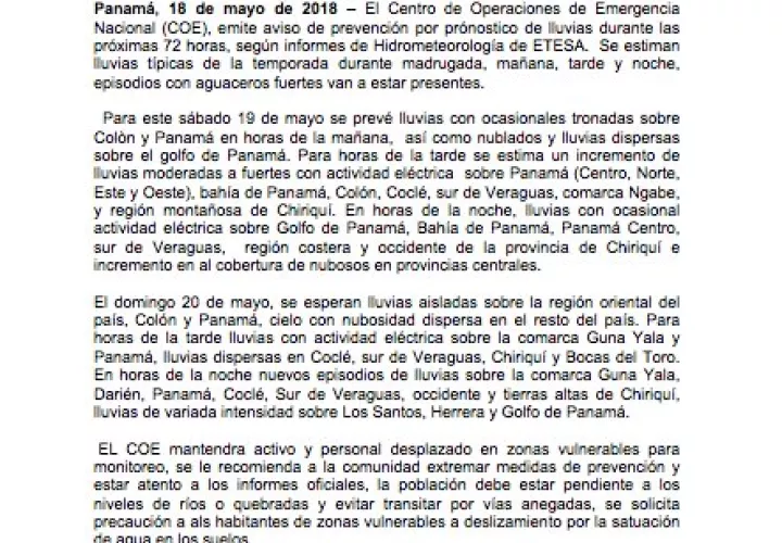 Panamá- El Centro de Operaciones de Emergencia Nacional (COE) emitió un aviso de prevención por prónostico de lluvias durante las próximas 72 horas, según informes de Hidrometeorología de la Empresa de Transmisión Eléctrica (ETESA).
