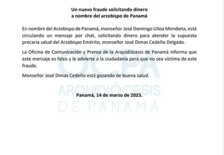 La oficina de Comunicación y Prensa de la Arquidiócesis de Panamá, a través de una nota de prensa, explica que a nombre de monseñor José Domingo Ulloa Mendieta, está circulando un mensaje de texto (chat), donde solicitan dinero para atender una situación de salud del prelado.