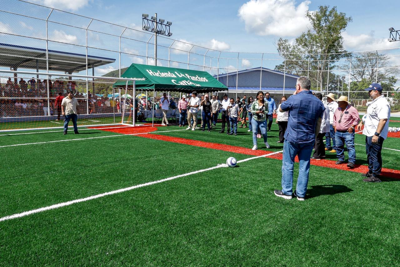 La cancha es de grama sintética, con dimensiones de 45 x 90 metros, iluminación completa, veredas, cerca perimetral, graderías, drenaje pluvial, baños vestidores, sistema eléctrico, plomería y criterios ambientales. Un espacio hecho para jugar, competir y soñar en grande.