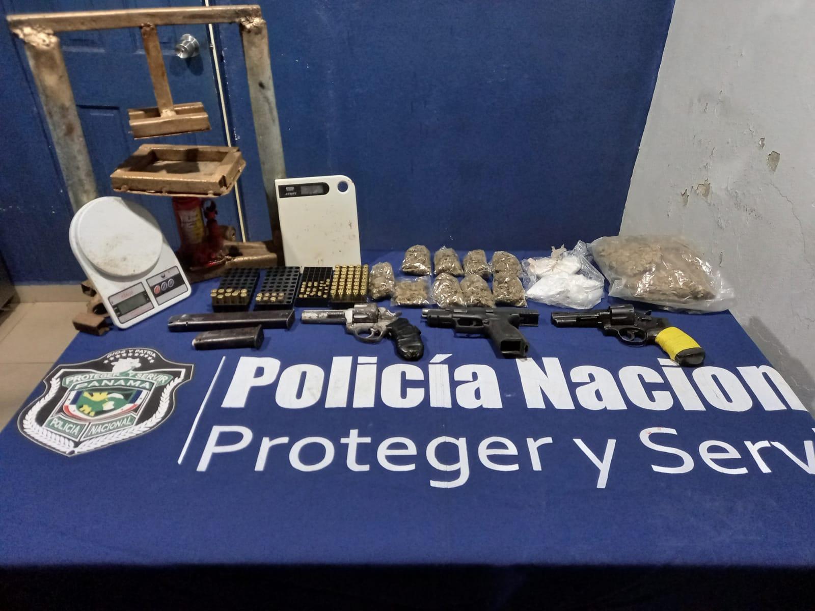 Una pistola calibre 40, dos revólveres calibre 38, dos proveedores para pistolas, 80 municiones de diferentes calibres, dos pesas digitales y cierta cantidad de polvo blanco y hierba seca que se presumen sea droga fueron ubicados este martes en un caleto ubicados por la Unidad Preventiva Comunitaria (UPC) de la Policía Nacional en la comunidad de Costa Deo Sol en el corregimiento de Pedregal en el distrito de David en la provincia de Chiriquí.