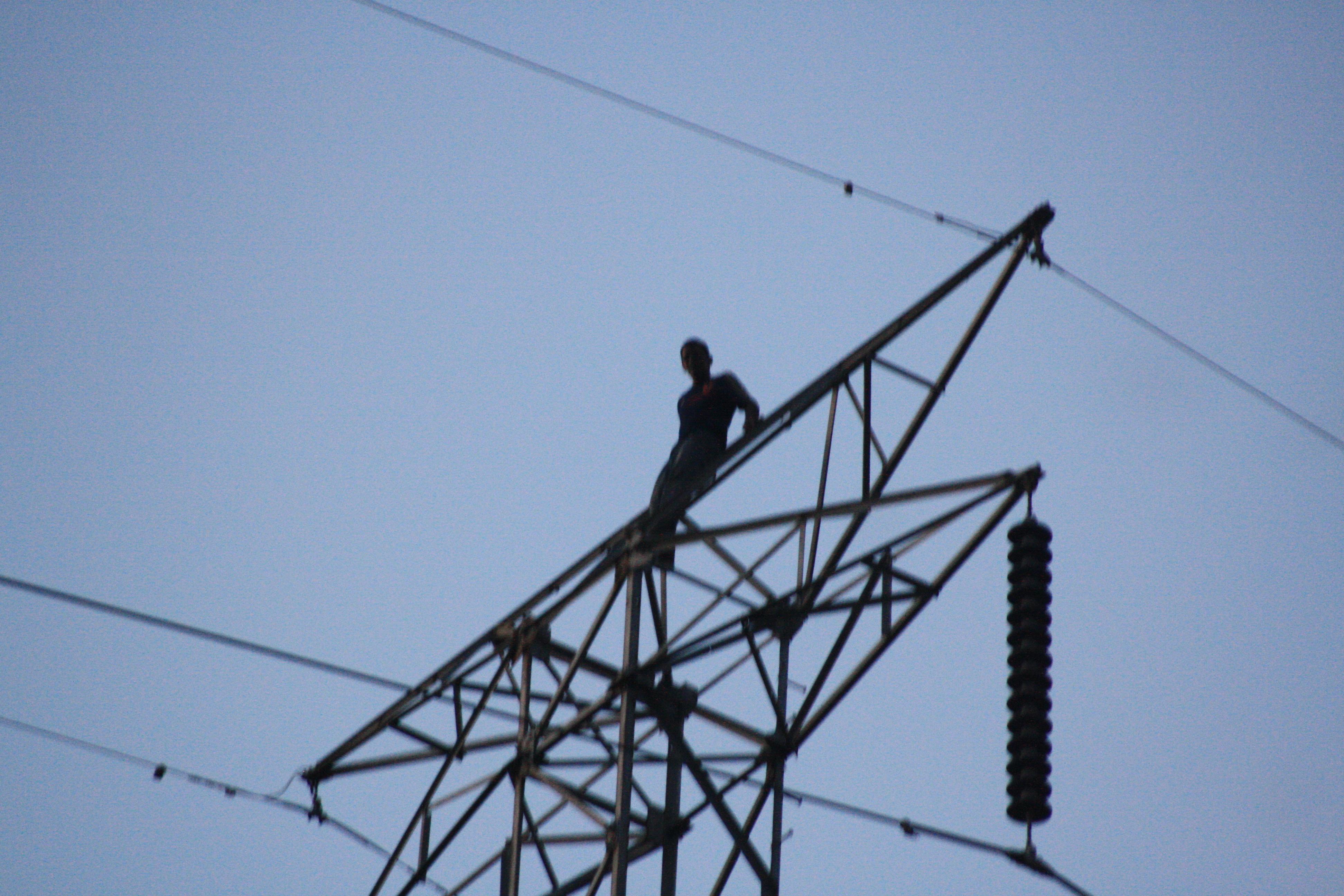 Hombre se sube a torre de transmisión eléctrica y mantiene en vilo a la gente