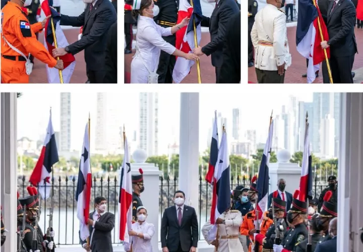 El vicepresidente hizo entrega del pabellón nacional a los abanderados del día: la enfermera Danays Castillo, del Ministerio de Salud; el Dr. Eduardo Hevia, de la Caja de Seguro Social; Comisionado Yadel Cruz, del Senafront); Jorge Barahona, miembro del Sinaproc; y José Plinio González, voluntario del Cuerpo de Bomberos.