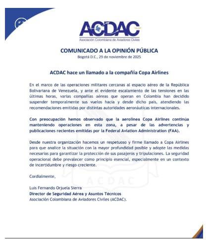 Ante la acción, la Asociaciones de aviadores y tripulantes de Colombia encendieron las alarmas y acusaron a Copa Airlines de poner en riesgo la vida del personal y los pasajeros al mantener operaciones en la zona.