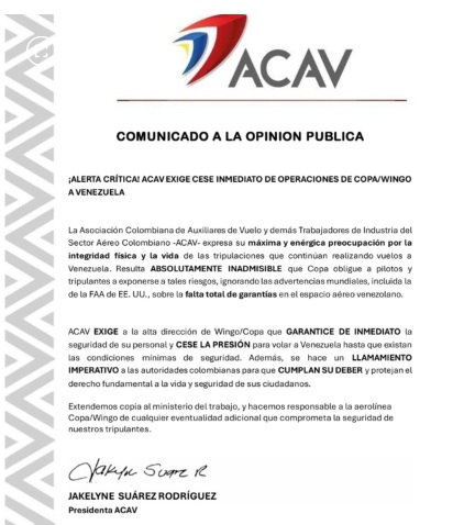 Ambas organizaciones exigen suspender vuelos hasta que existan “condiciones mínimas de seguridad”, y pidieron a las autoridades colombianas intervenir para garantizar que la vida del personal y los pasajeros sea prioridad total.
