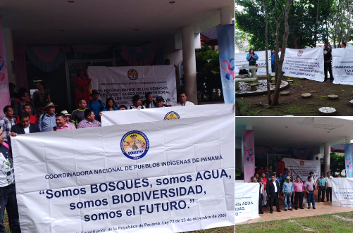 Panamá- Miembros de la Coordinadora Nacional de Pueblos Indígenas protestan hoy en la parte exterior de la sede del Ministerio de Ambiente (Mi Ambiente), ubicada en el área revertida.