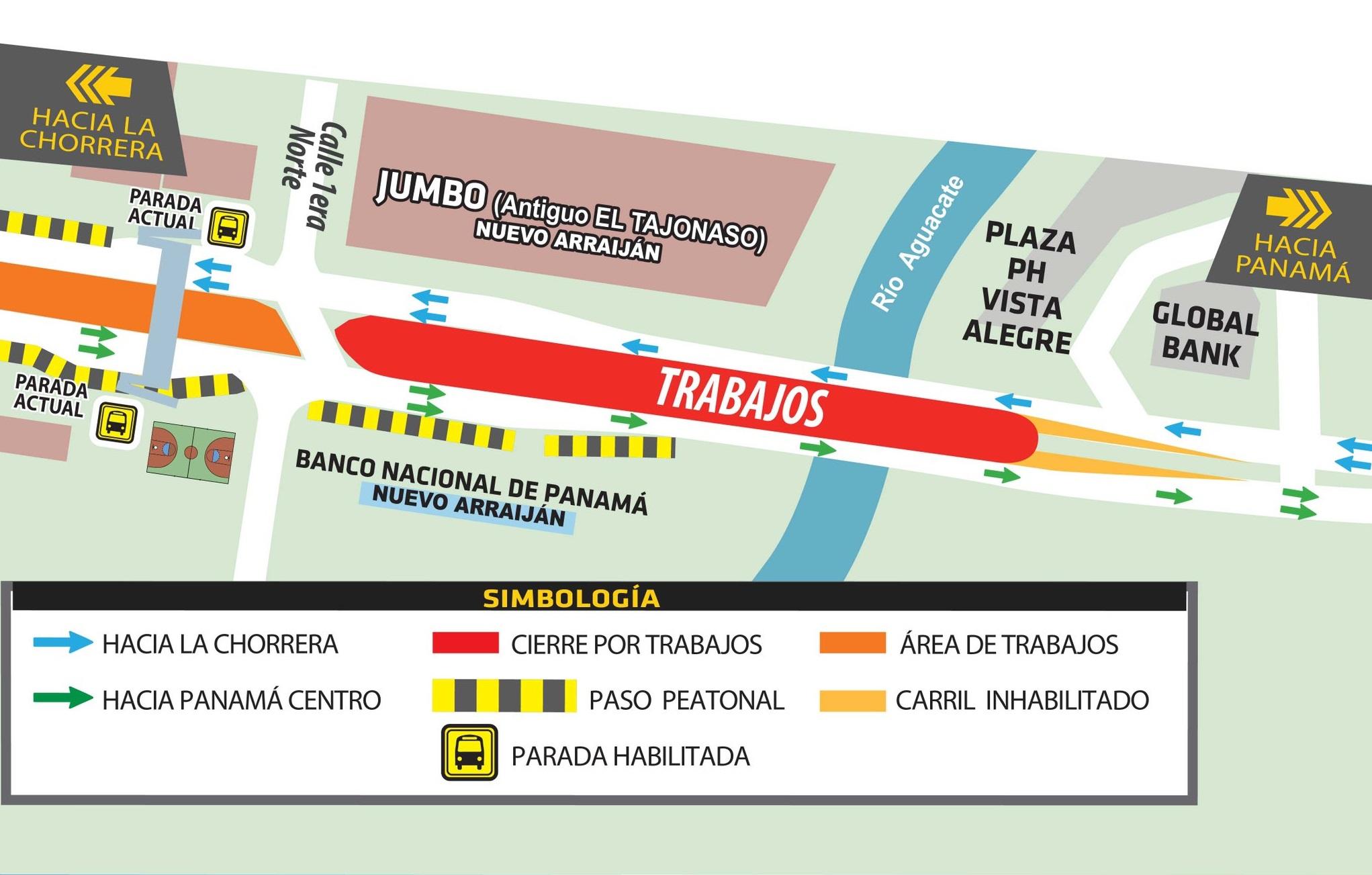 Detallaron que en la vía solo quedará habilitado un carril en ambos sentidos, desde la sucursal del Global Bank, ubicada en la Plaza PH Vista Alegre hasta el Súper Jumbo (antiguo Tajonaso).