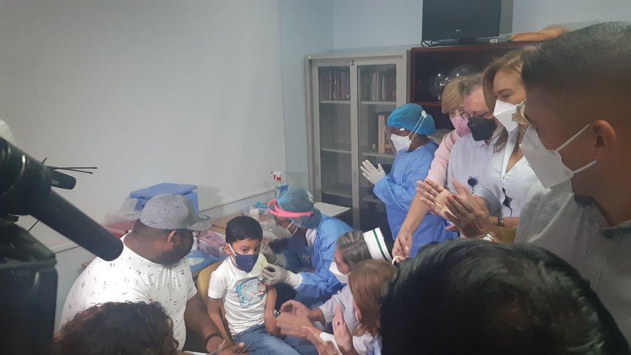Panamá- Jassier Clark, de 8 años, el primer niño vacunado contra la Covid -19 en Panamá en el hospital de especialidades pedriátricas de la CSS. En el acto formal están presentes la Primera Dama de la República, Jazmín de Cortizo; viceministra de Salud, Ivette Berrio y autoridades médicas.