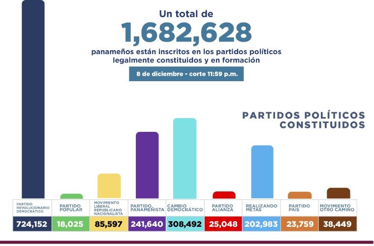 El Partido Revolucionario Democrático (PRD) tiene 724,152 miembros; Cambio Democrático (CD), 308,492; el Partido Panameñista, 241,640; Realizando Metas (RM), 202,983; Molirena, 85,597; Movimiento Otro Camino (MOCA), 38,449; Partido Alianza, 25,048; Partido Alternativa Independiente Social (PAIS), 23,759; y el Partido Popular (PP) cuenta con 18,025 inscritos.