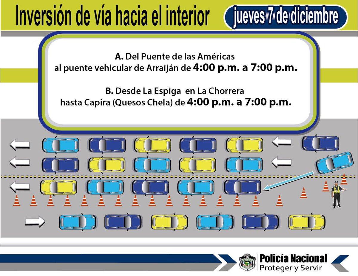 Ismael Herrera, director de Operaciones de la Policía de Tránsito, anunció que a partir de hoy y hasta el próximo domingo realizan operativo de inversión de carriles hacia el interior.  El horario de  4:00 p.m. a 7:00 p.m. desde el puente de Las Américas hasta el puente vehicular de Arraiján y  desde La Espiga hasta Quesos Chela.