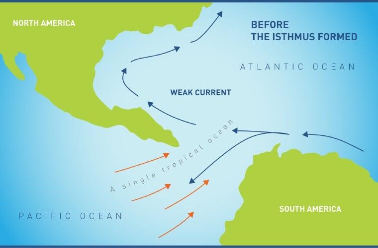 "El grupo de Montes y Jaramillo no descarta algunos pasos temporales del mar somero de edad más reciente a través del istmo, pero es claro que las conexiones terrestres, así como la interrupción de las aguas profundas y las corrientes circuntropicales, datan de más de 10 millones de años".