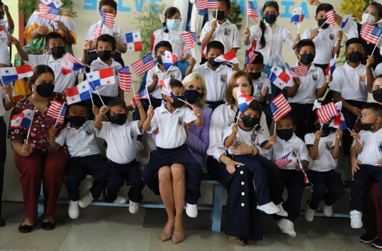 Previo a conocer el programa Ver y Oír para Aprender, la primera dama Jill Biden fue recibida por los niños de la Escuela Hogar de la Infancia que portaban banderas de Panamá y Estados Unidos, también uno de ellos le brindó unas palabras de bienvenida en inglés.