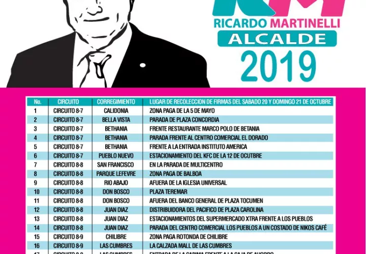 Panamá- Este fin de semana (20 y 21 de octubre) se efectuará una jornada de recolección de firmas a favor del expresidente de la República, Ricardo Martinelli, a fin de lograr su candidatura a la Alcaldía de Panamá por la libre postulación.