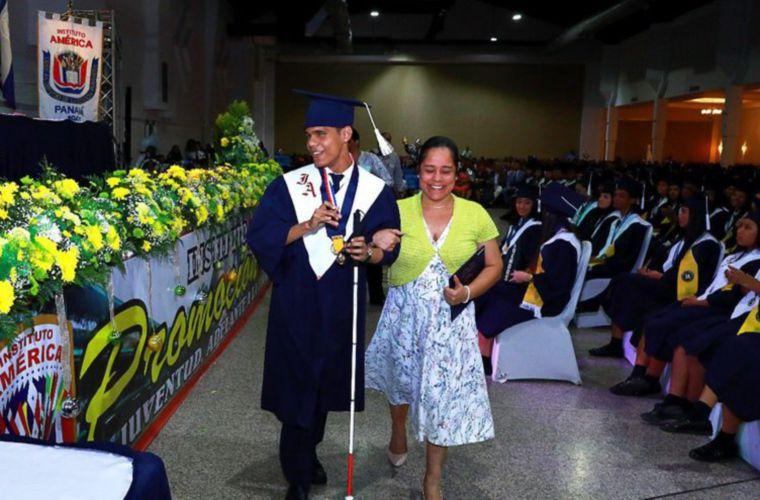 El joven con discapacidad visual Raúl Durán se graduó con el primer puesto de honor de la promoción 2019 del Instituto América.