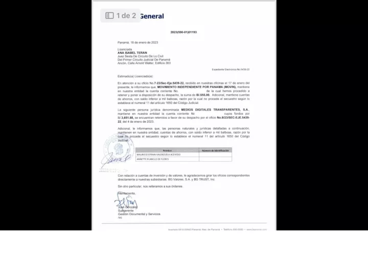 El 4 de enero, el Juzgado envió un oficio al Banco General para que hiciera las retenciones por la cuantía antes señalada. Este oficio también fue girado a más de 34 entidades bancarias que operan en el país.
